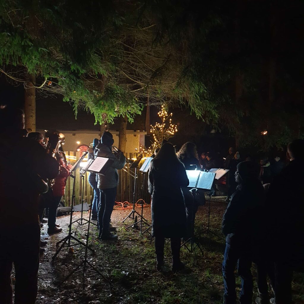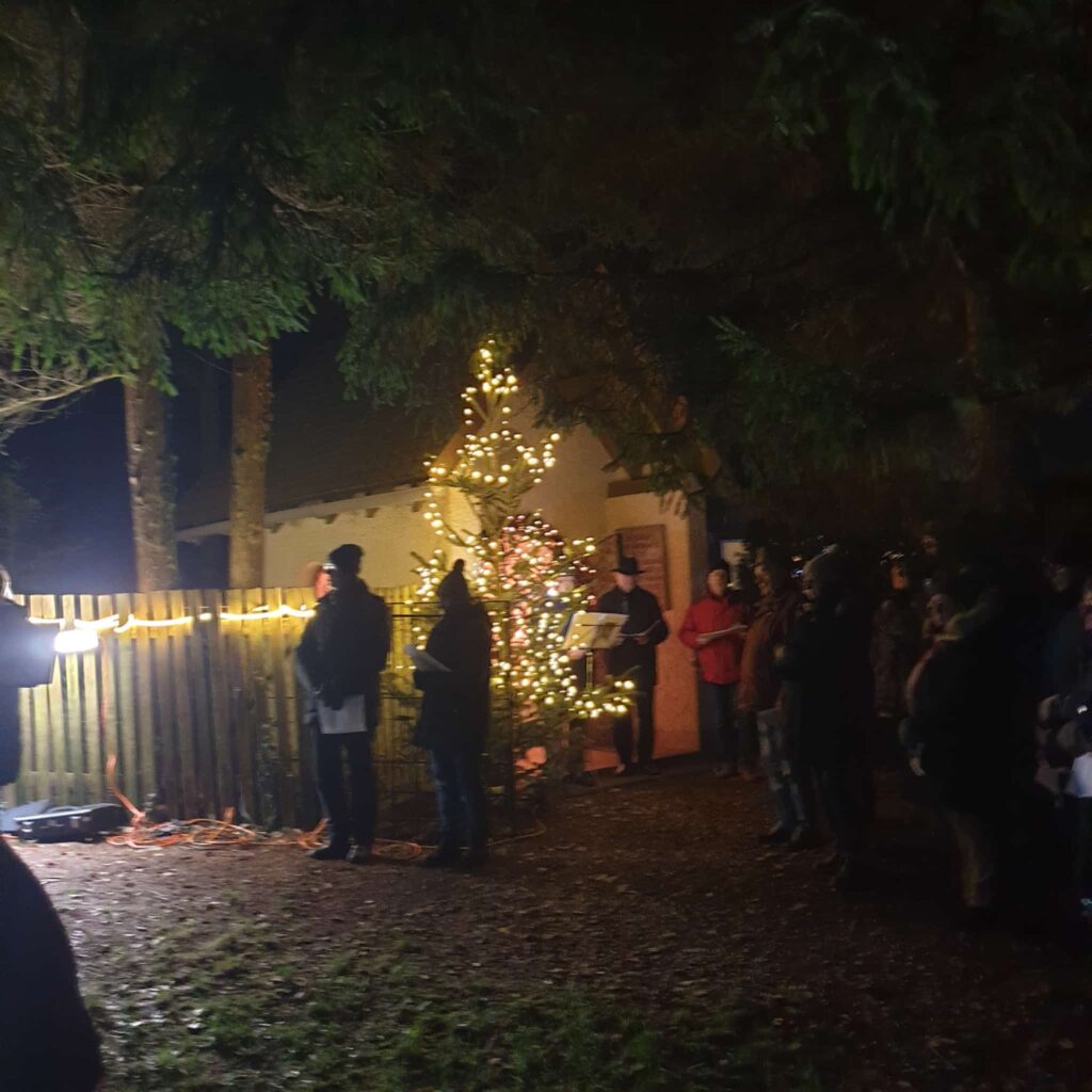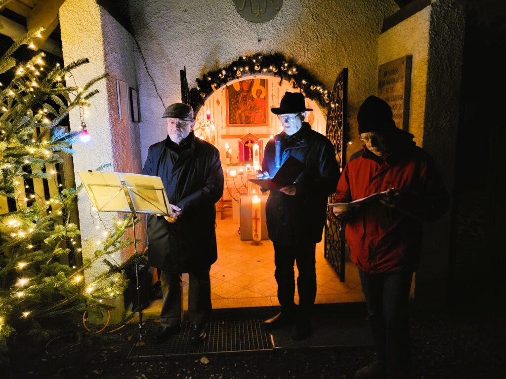 Die Marianische Männer-Congregation, die Katholische Arbeitnehmerbewegung und die Schützengesellschaft Adlerseige hielten gemeinsam eine Andacht (Waldweihnacht) mit Texten des Hausgottesdienstes der Diözese „Auf dem Weg in Gottes Licht“ an der Marienkapelle am Tegelweg in Tegernheim. Martin Schächinger, 1. Schützenmeister und Herbert Ettle, Obmann der MMC unterstützten dabei Pfarrer Andreas Kuniszewski beim Vorbeten.